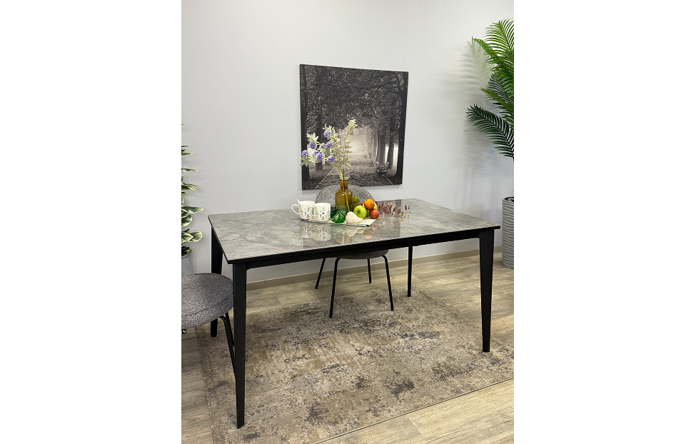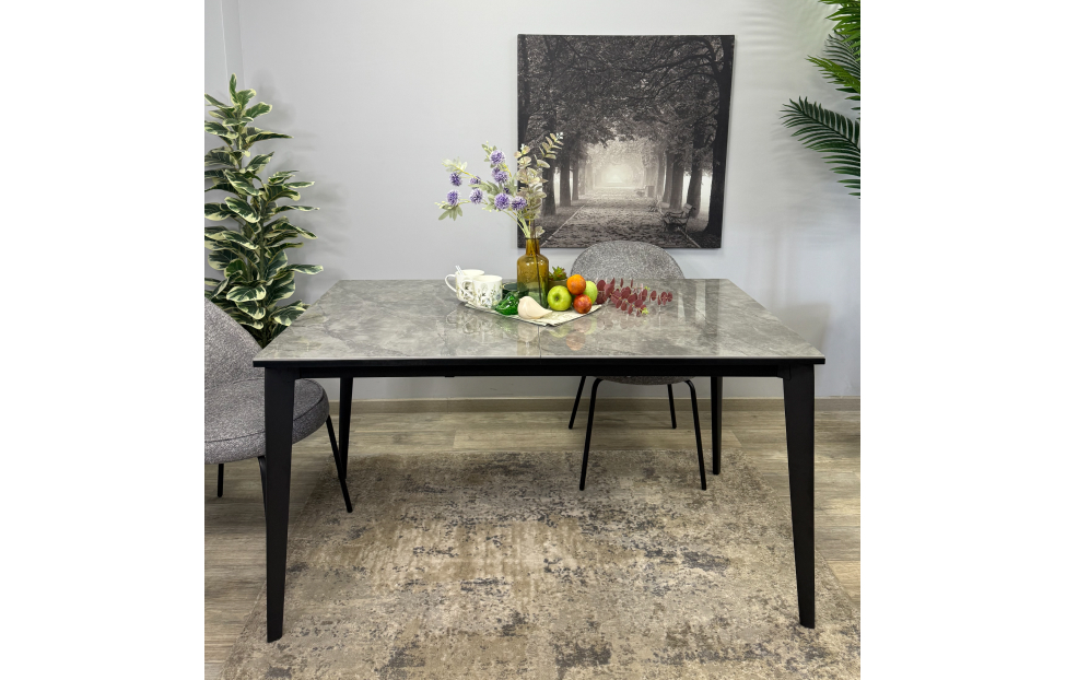 Стол обеденный Дега раздвижной KR1400 – стильный и практичный стол с керамической столешницей, которая отличается высокой прочностью и долговечностью. Каркас выполнен из стального профиля и окрашен в черный цвет, который гармонично сочетается с глянцевой поверхностью керамики.