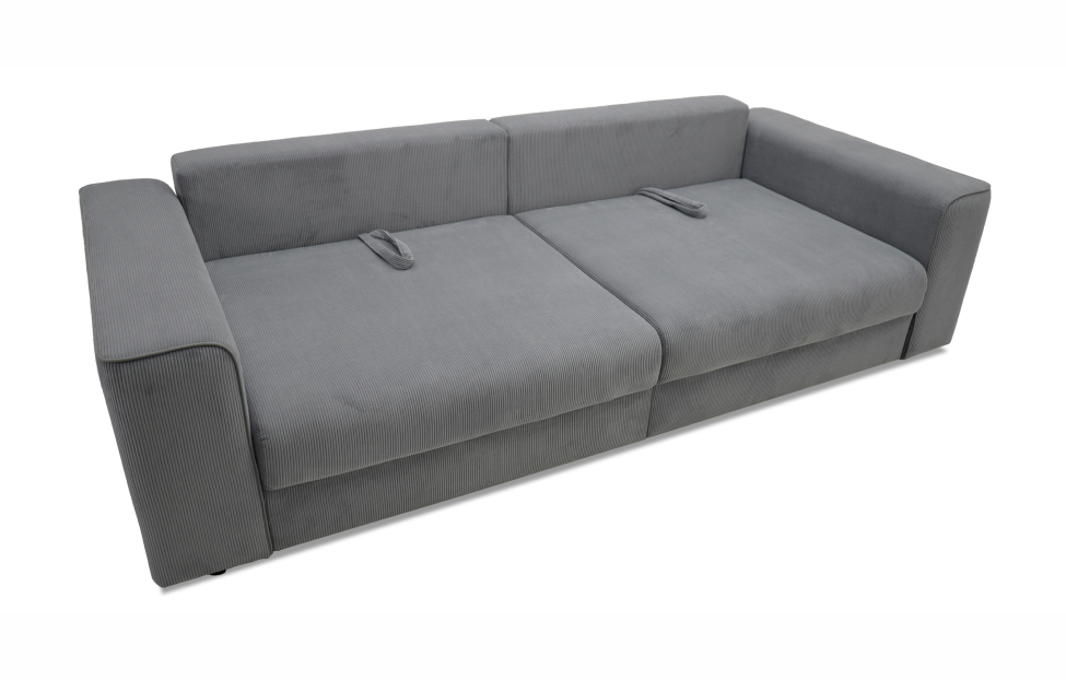 Диван выполнен в современном стиле, который будет гармонично смотреться в любом интерьере. Обивка из велюра c вертикальной текстурой актуального серого оттенка приятна на ощупь и легко чистится.